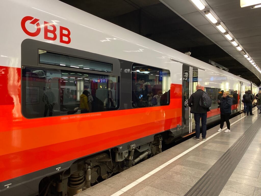 ウィーン国際空港で「OBB」と書いた赤い発券機でチケットを購入できて(英語)、クレジットカードも使えます。