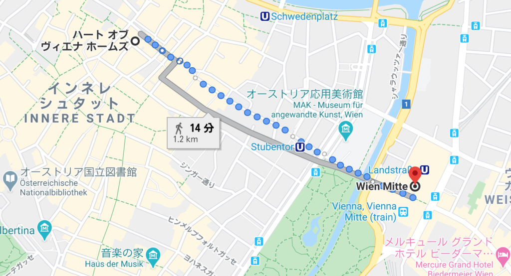 まず、ホテルへ向かいます。チェックインは14:00〜15:00で、ちょうど良い時間に。ウィーンの滞在は2泊3日なので、キッチンがついたアパートメントタイプの部屋を借りました。ウィーンミッテ駅から歩いて14分で、スーツケースもありますが、歩いて向かいました。