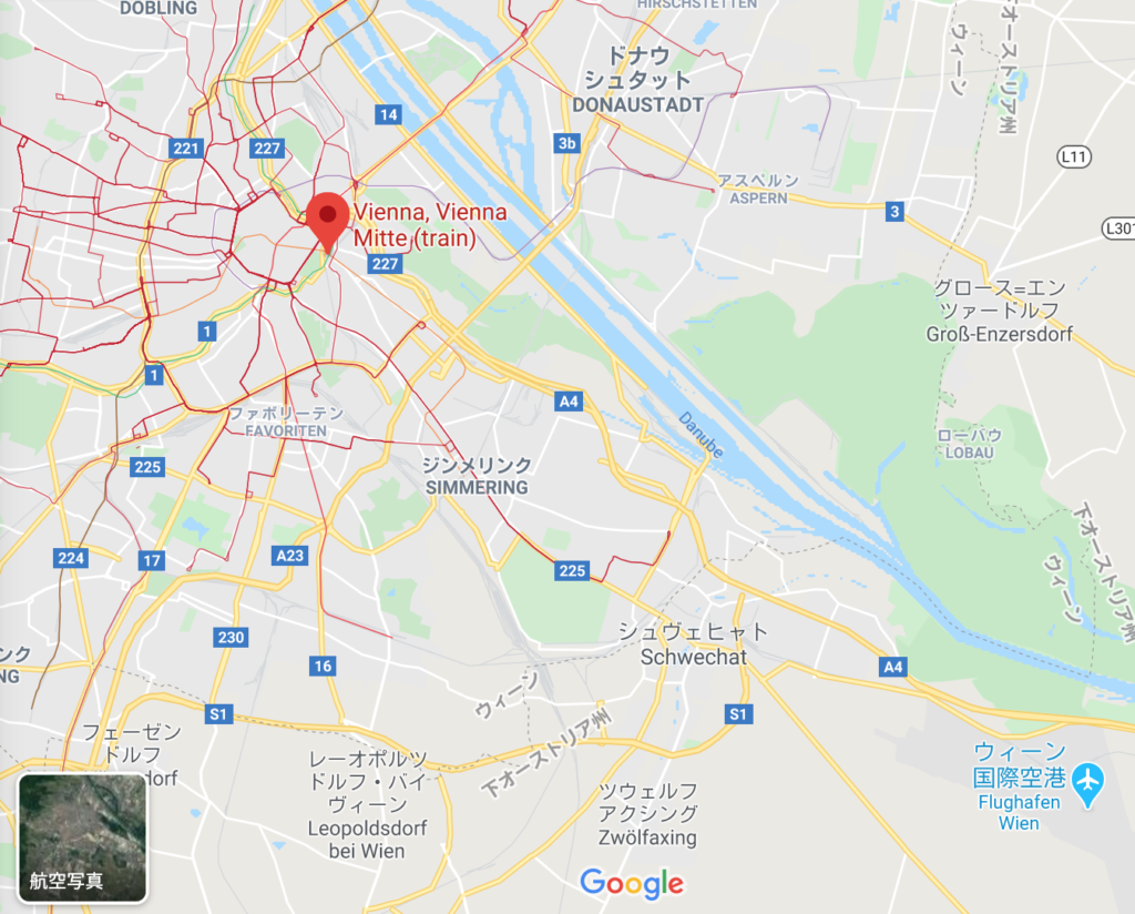 右下「ウィーン国際空港」から右上「ウィーンミッテ駅」へ