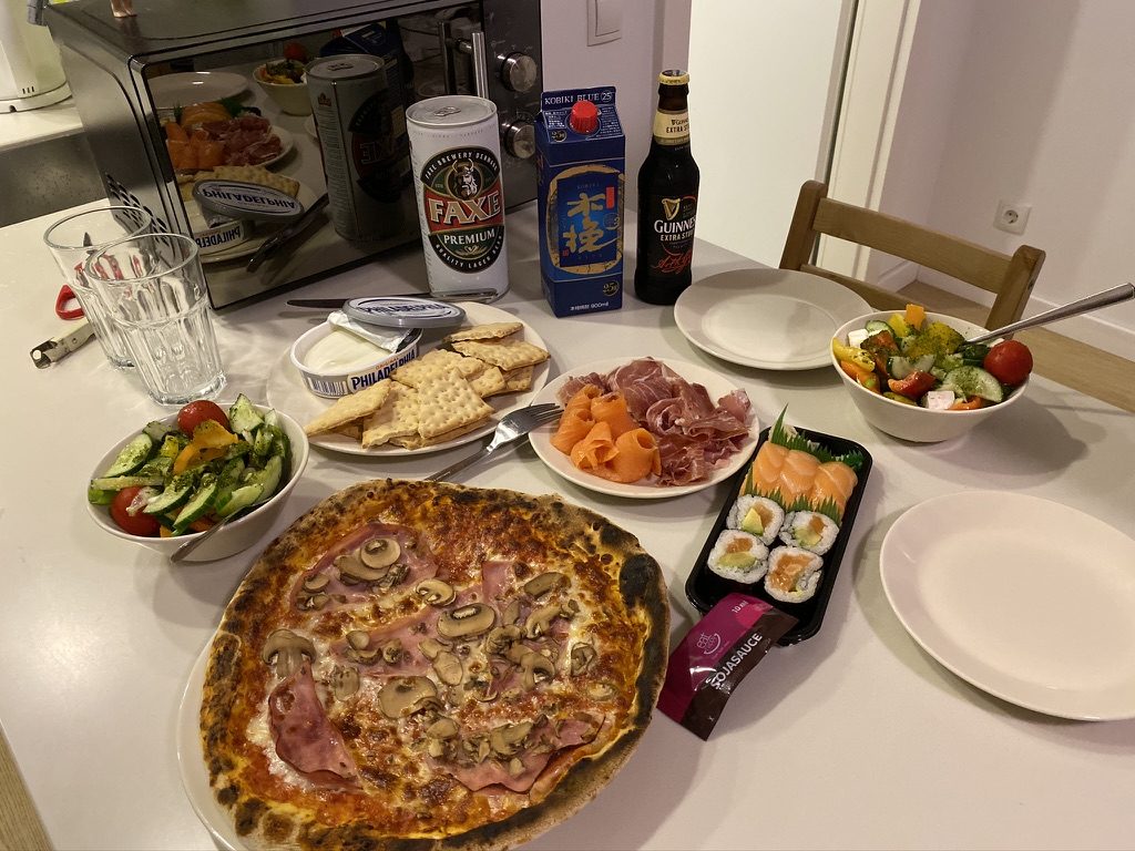 ホテルに帰り、スーパーで買ったものでディナーを。冷凍のピザや、ハム、サーモン、寿司、サラダなど欲望のままのご飯を。