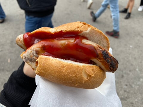 これは白いウィンナーが2本入っています。私はマスタードが苦手なのでケチャップにしてもらいました。見かけた人はほとんどマスタードでした。子供がケチャップ。