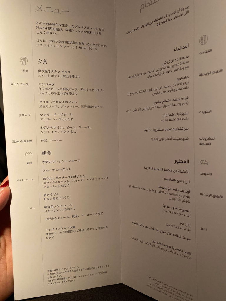 飛行機に乗ると、ほどなくディナーがが始まります。メニューは日本語表記もあったので、わかりやすい。