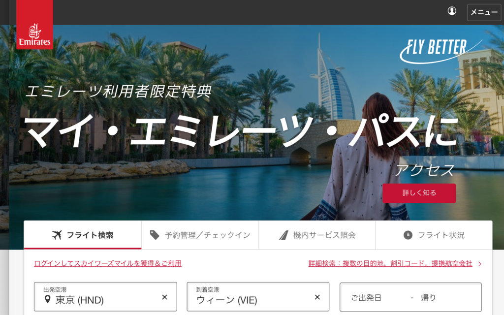 今回はオーストリアをメインに回る予定でしたので、「羽田→ドバイ→ウィーン」を往復で予約しました。